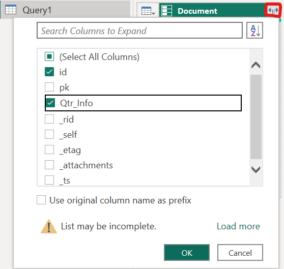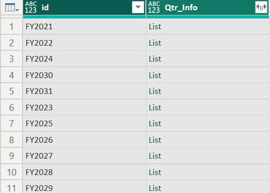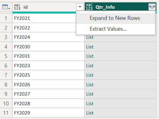 - Expand the Qtr_Info column again by clicking the expand icon and selecting Expand to New Rows