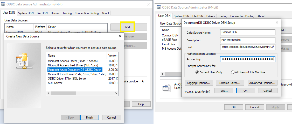 Provide a meaningful data source name (e.g. Cosmos DSN) and add description --> Enter the host name and the read-only access key.