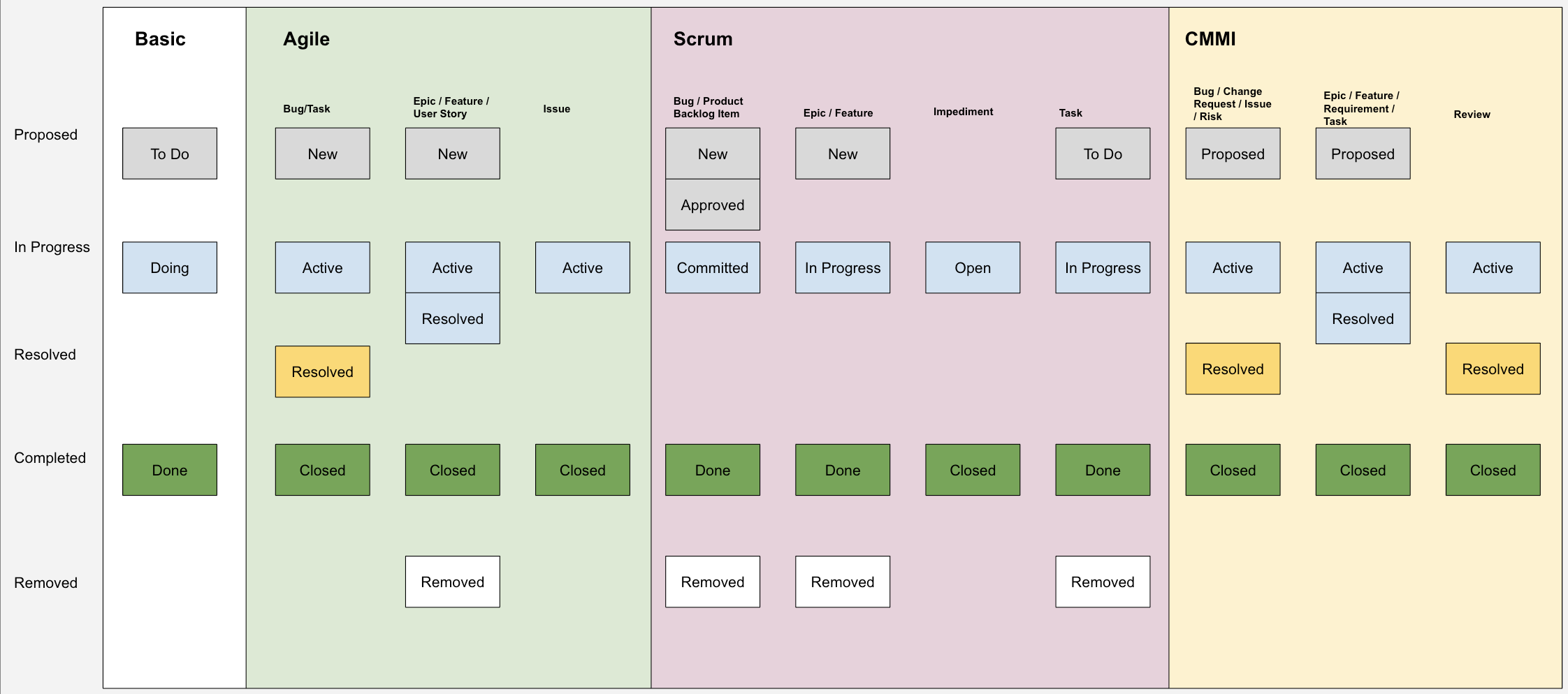 The image below is a nice illustration of the various state names and equivalents across the default process templates from Microsoft.