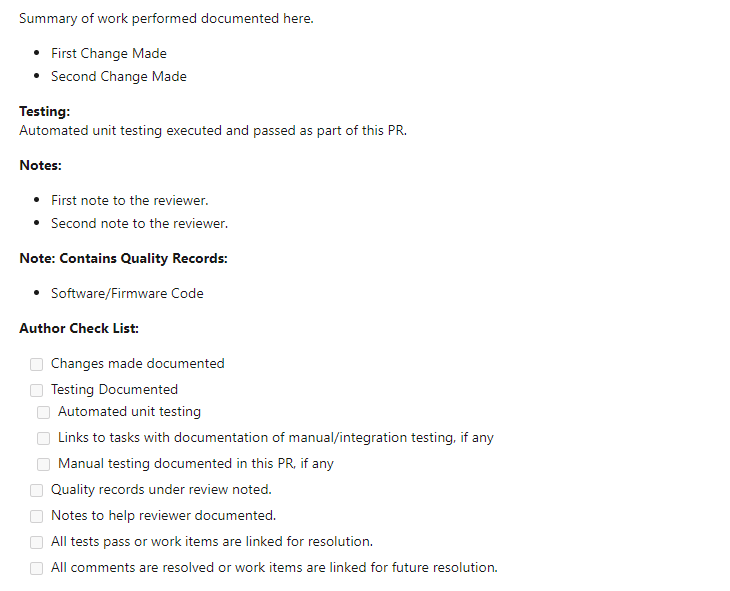 Having good documentation practices captured on pull requests is critical for both having high quality software and also maintaining a history for regulators to look at if an investigation is ever launched on work performed. This process discusses both good documentation practices on pull requests and a generalized process for documenting Pull Requests with Azure DevOps using Repos. Note that this process documents also the use of pull request templates to help people remember the contents and format for good documentation practices.
