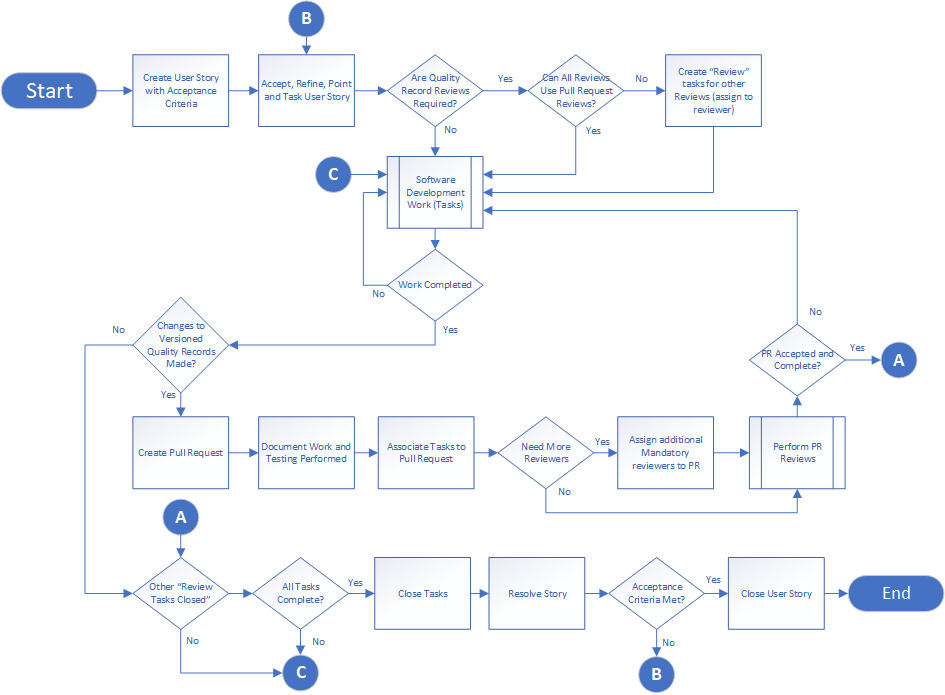- If the task contains versioned quality records in azure devops repos the author creates a pull request to integrate their changes when the task is complete.